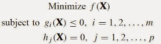 di mana X adalah vektor n-dimensi yang disebut vektor desain (dalam kasus kami vektor desain terdiri dari koordinat x dan y relatif terhadap lokasi antena pada peta), f (X) disebut fungsi tujuan (dalam contoh ini fungsi obyektif adalah jumlah jarak antara antena dan konsumen yang ditimbang oleh konsumsi rata-rata setiap pelanggan), g (X) dan h (X) masing-masing dikenal sebagai kendala ketidaksetaraan dan kesetaraan.